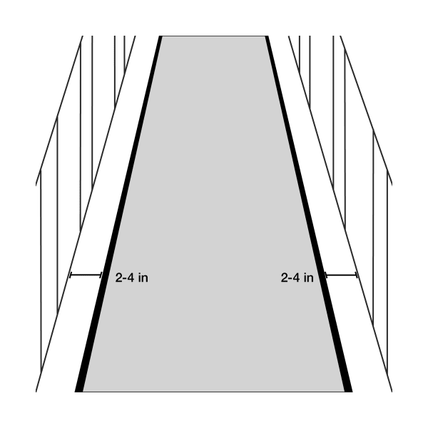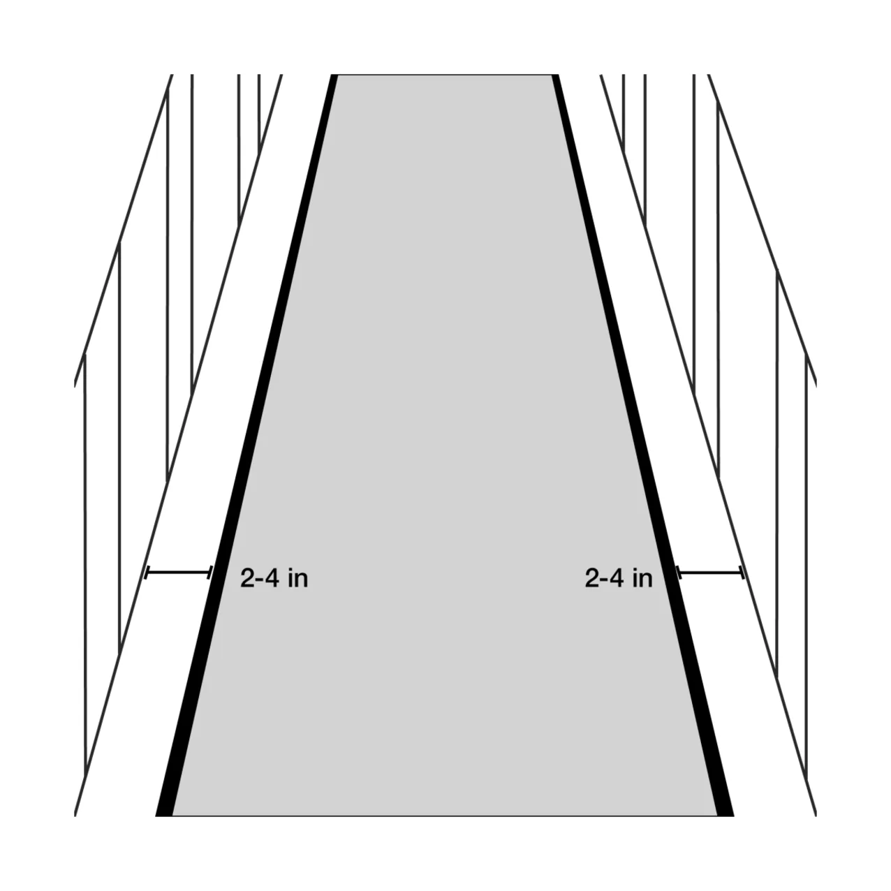 Leave 2–4" of exposed floor along each edge of the rug for a tailored look. The rug should run the full length of the hallway but never wall-to-wall. Be sure the rug and border height clear the swing of any doors and/or any transitions.