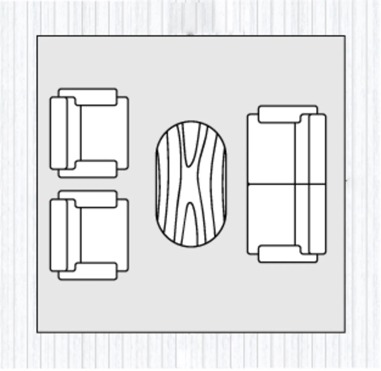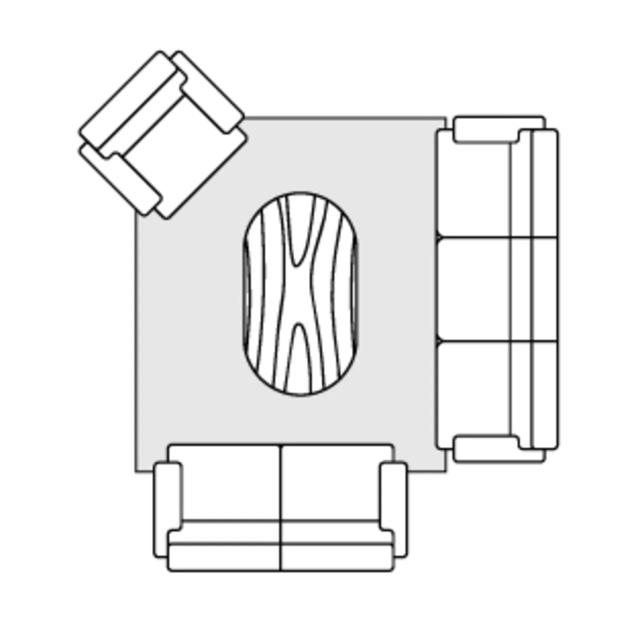 Living Room | 6' x 9' → 10' x 14' | Keep at least the front legs of the furniture on the rug for a finished look and to anchor the space. |